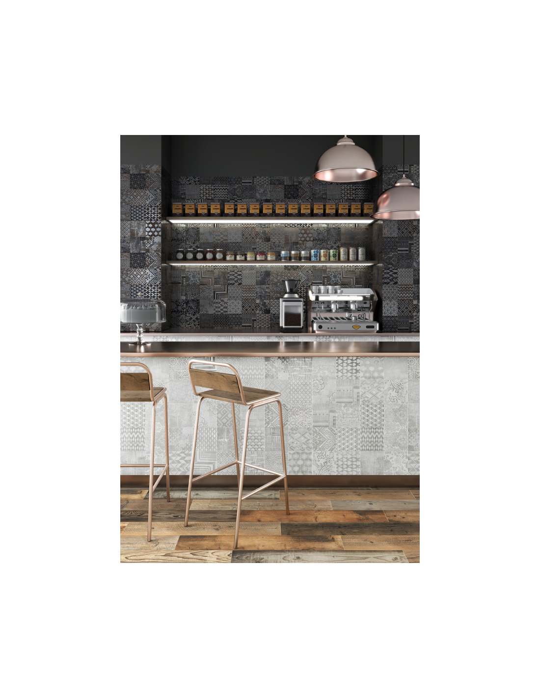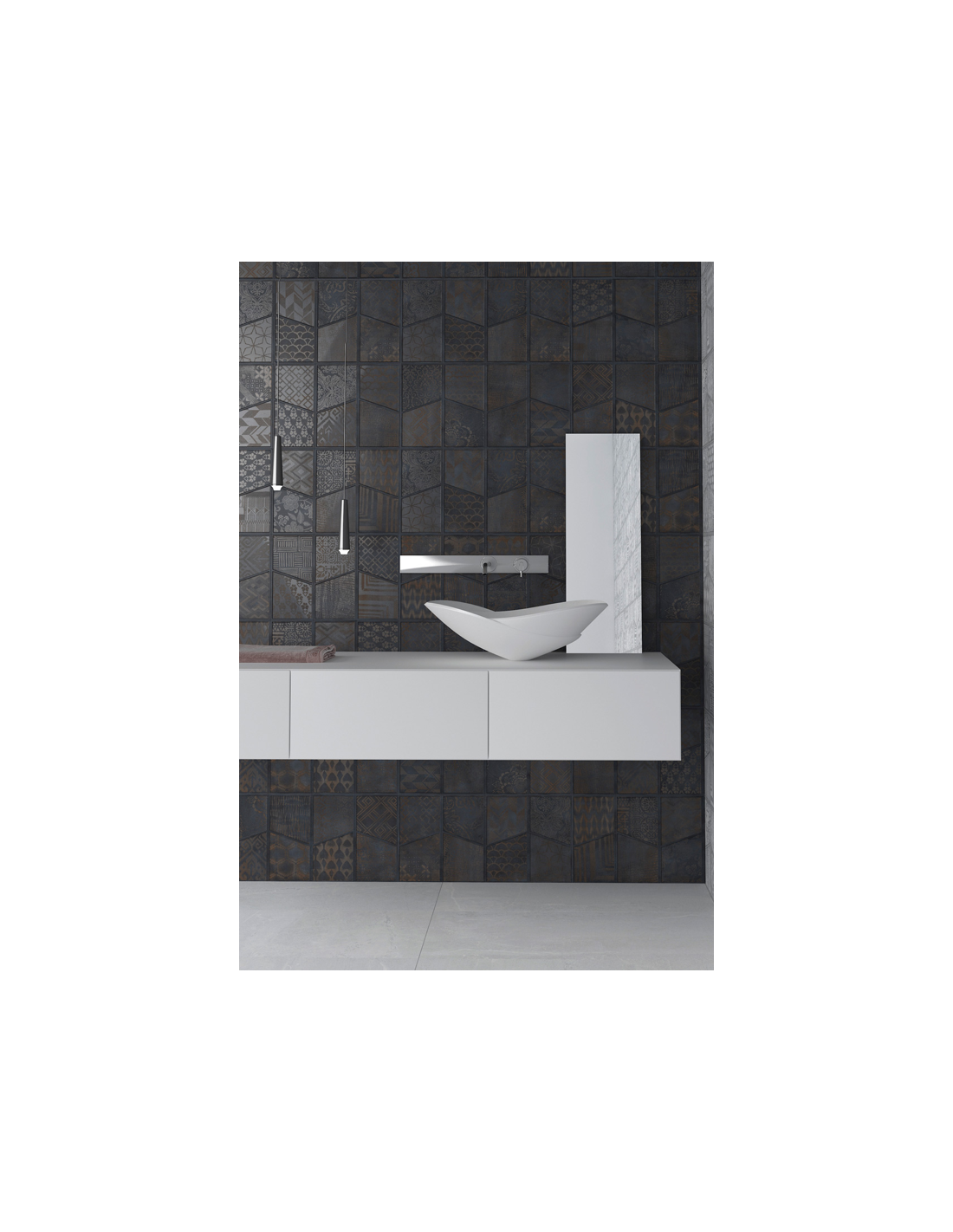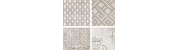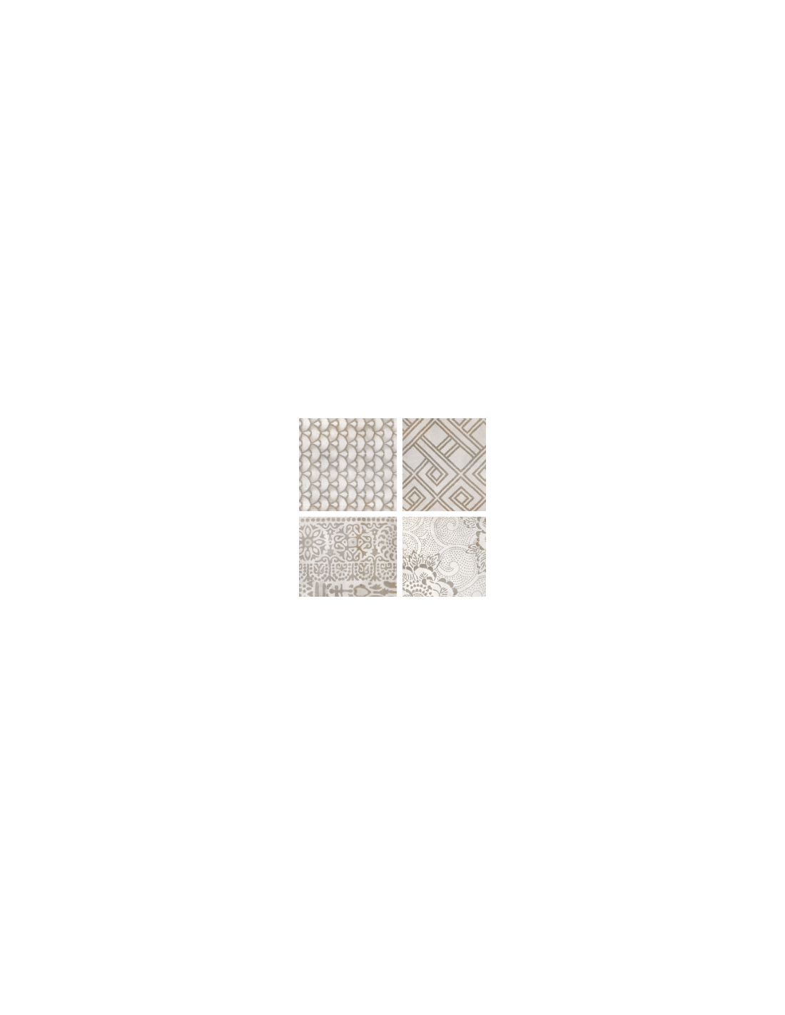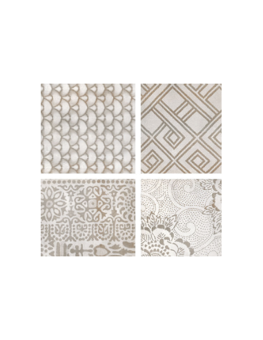 Colección talismán, que cautiva por la combinación de elementos clásicos de diferentes naturalezas, bañados todos con la misma esencia de lujo y sofisticación que nos ofrecen los sutiles juegos de brillos y mates emulando preciosas telas con combinaciones de hilos de seda y lúrex. Piezas que hechizan, motivos que cuentan historias, instantes o momentos especiales, cada uno con una personalidad única. Superficies con el encanto de un acabado tornasolado, en tono Dark con una atractiva mezcla de azules petróleo con óxidos rojizos, y en los tonos Blanco y Crema con matices perlados de platas y dorados. La colección se presenta en taco de 16×16, 4 motivos combinados en 33×33 y pieza decorativa combinando 8 motivos en 32×62.