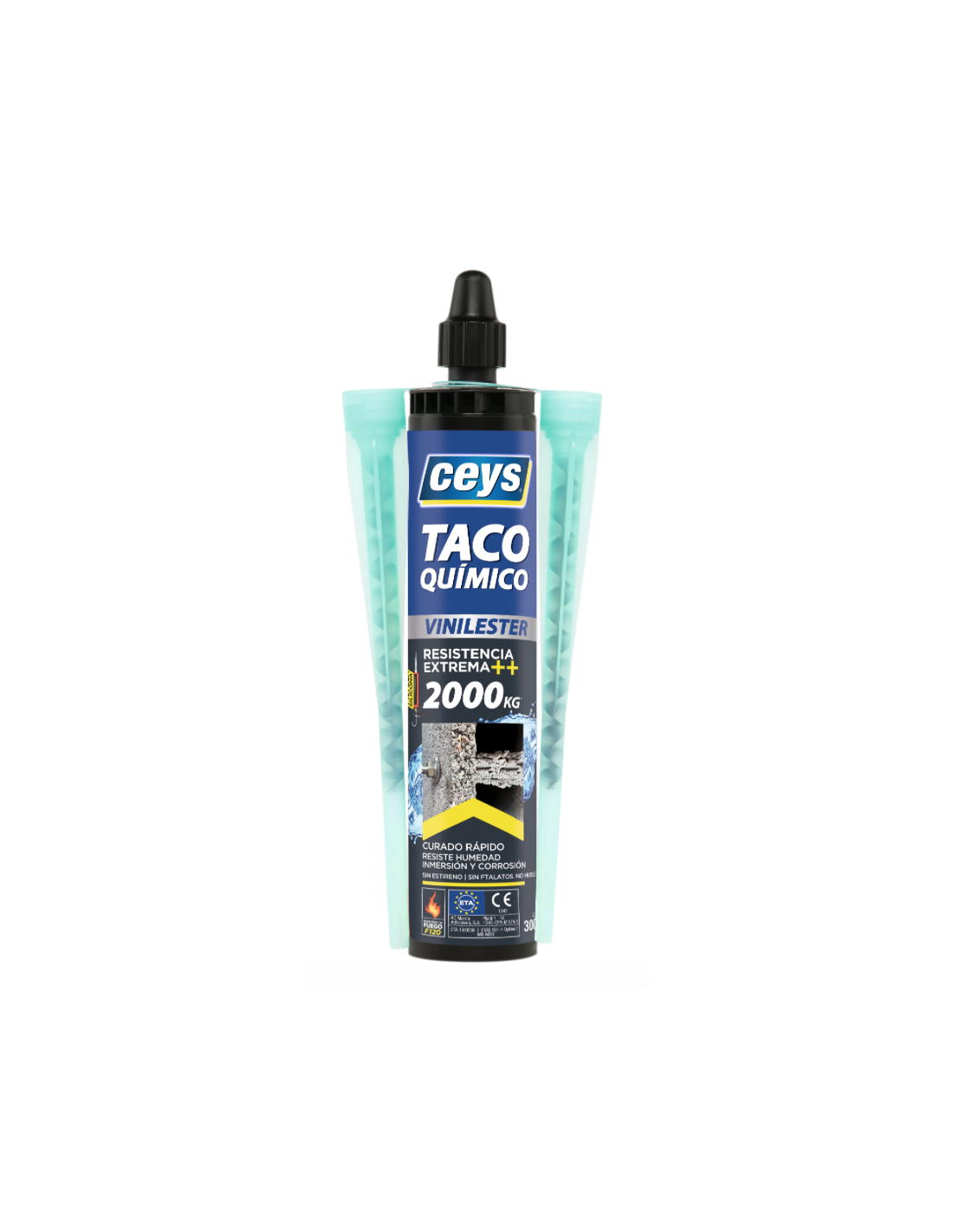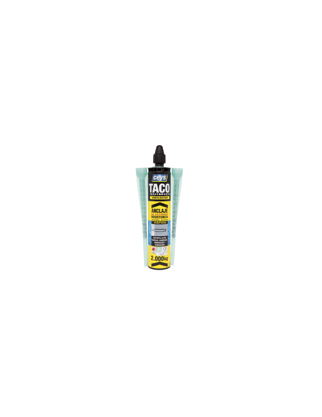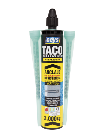 Ceys Taco Químico Vinylester bicomponente asegura un anclaje extremadamente resistente sobre soportes huecos, frágiles o compactos tipo ladrillo, hormigón, cemento, piedra natural, madera