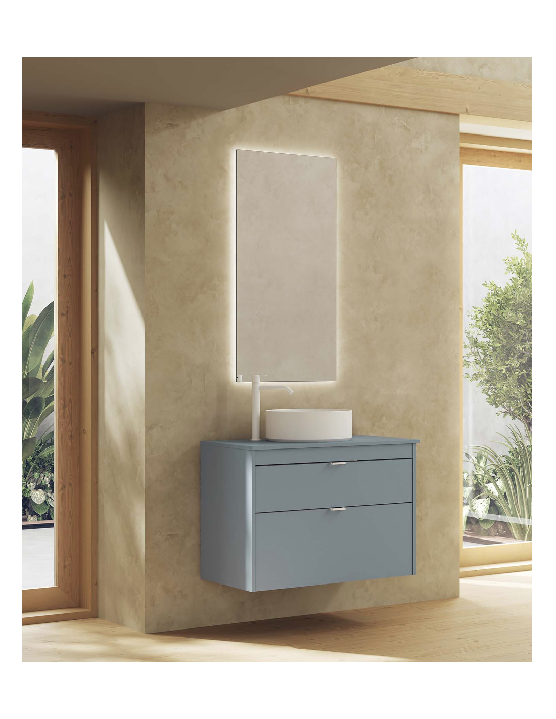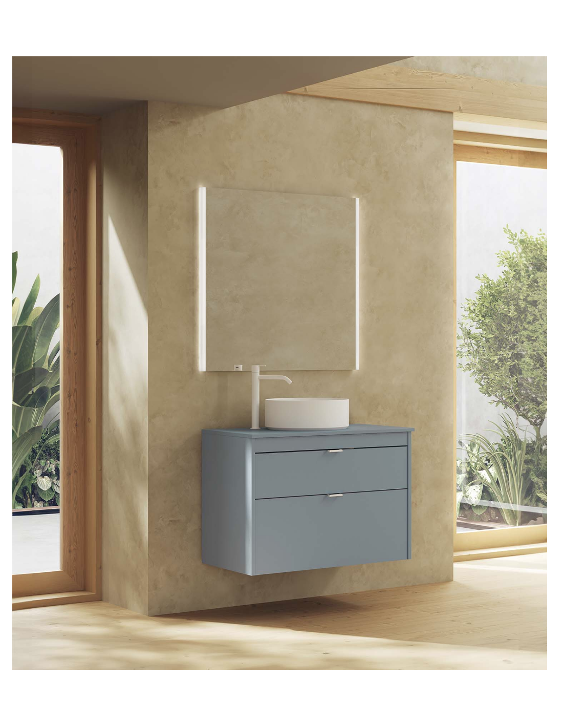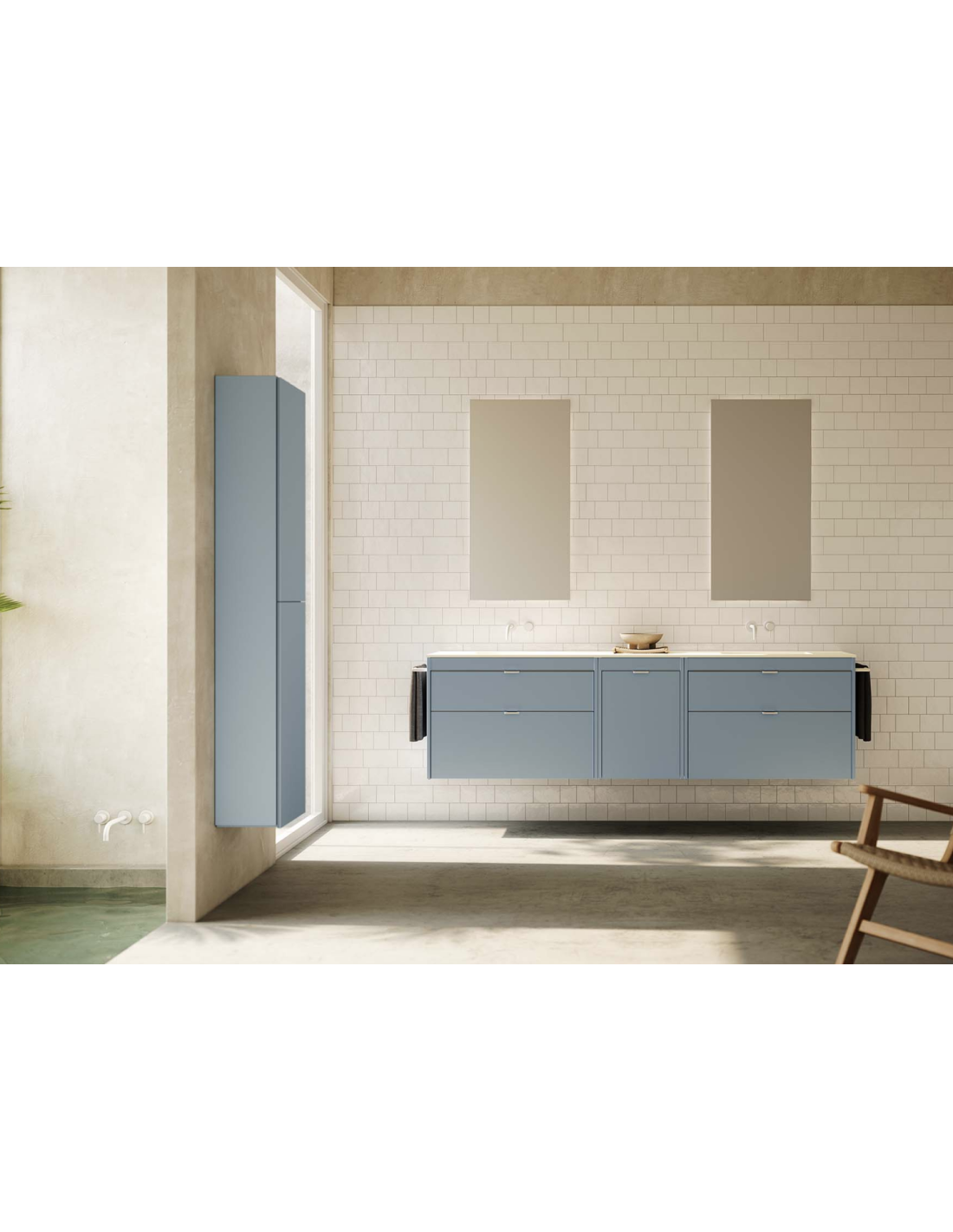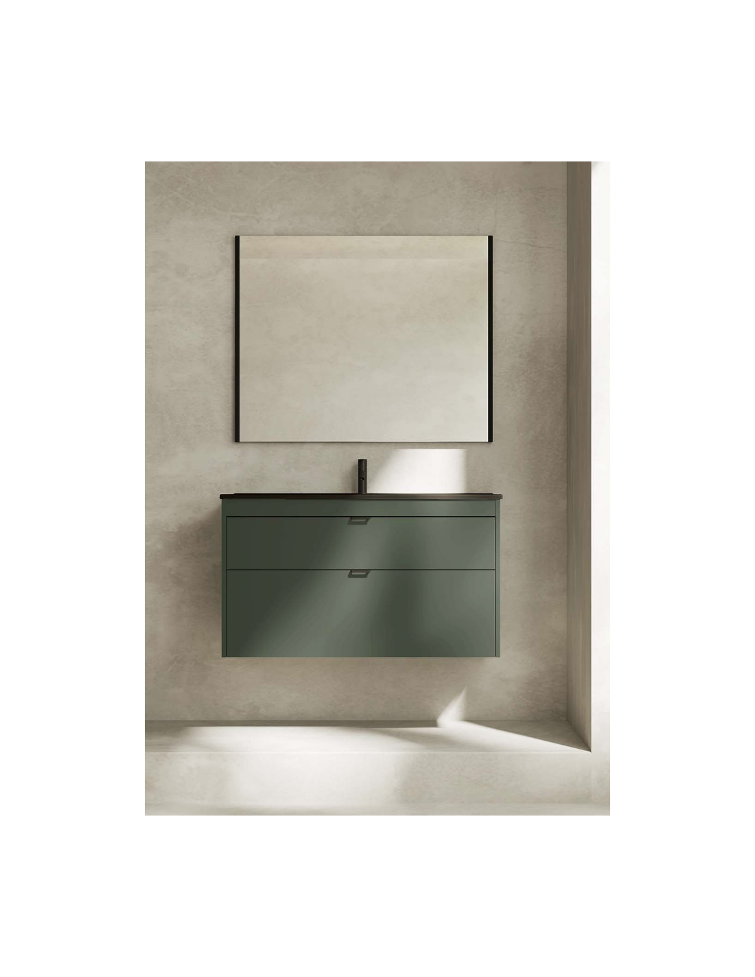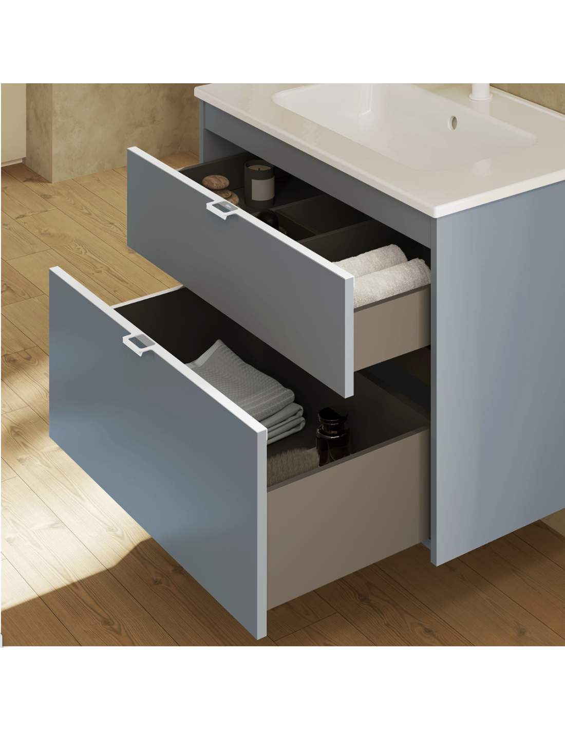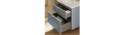 Funcionalidad con un diseño de líneas rectas, un discreto tirador integrado con nuestro logo en el cajón superior, y un frente bajo del lavabo para generar simetría.
