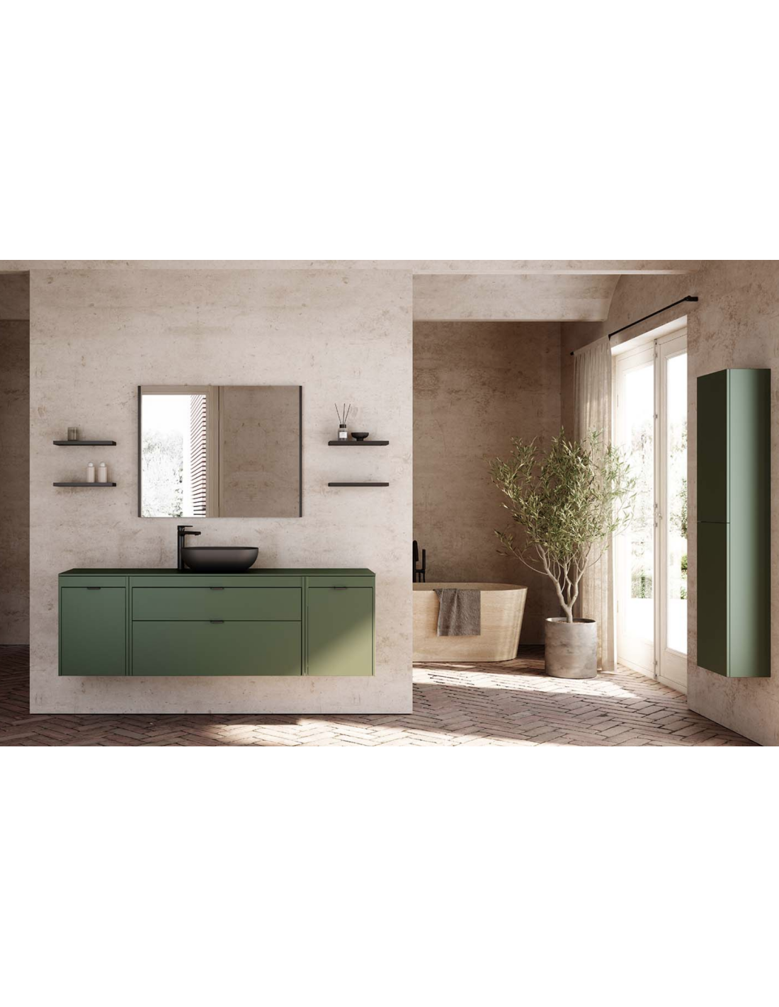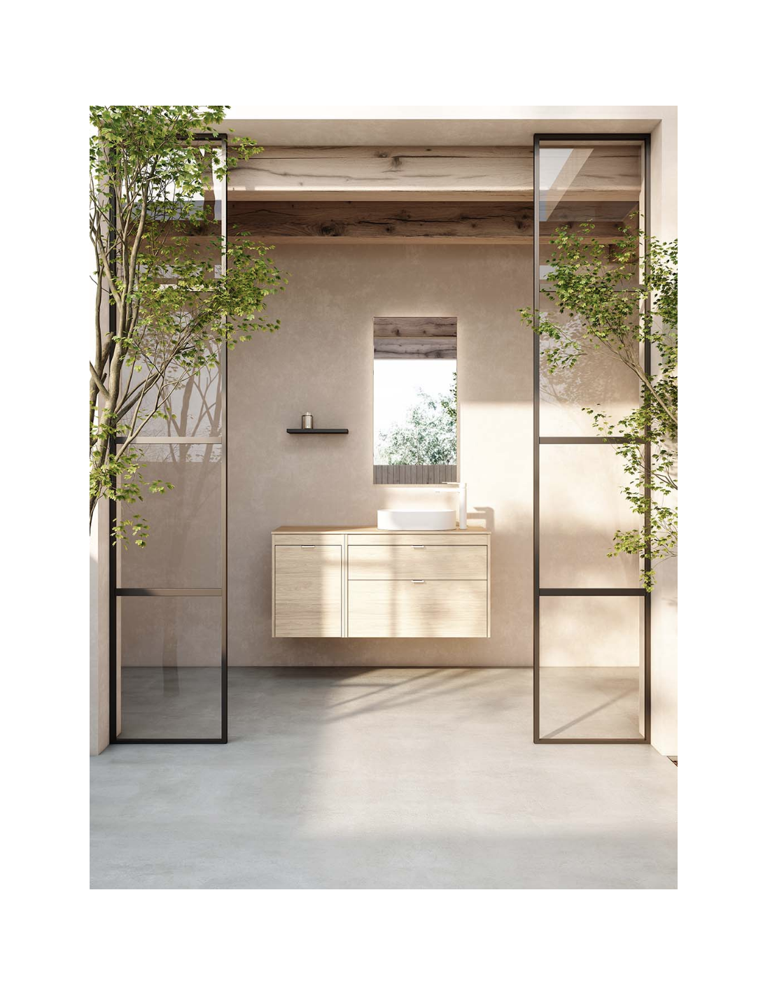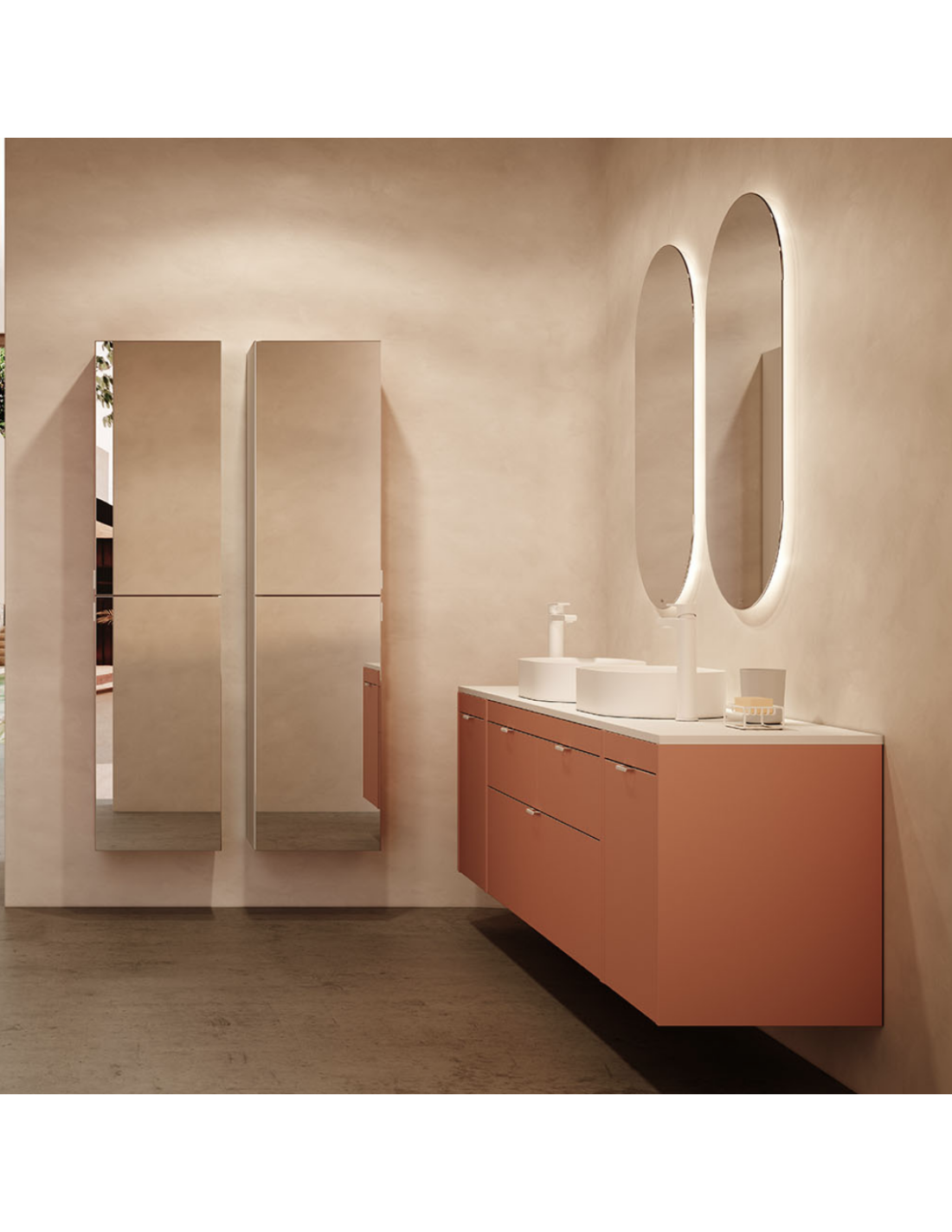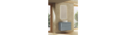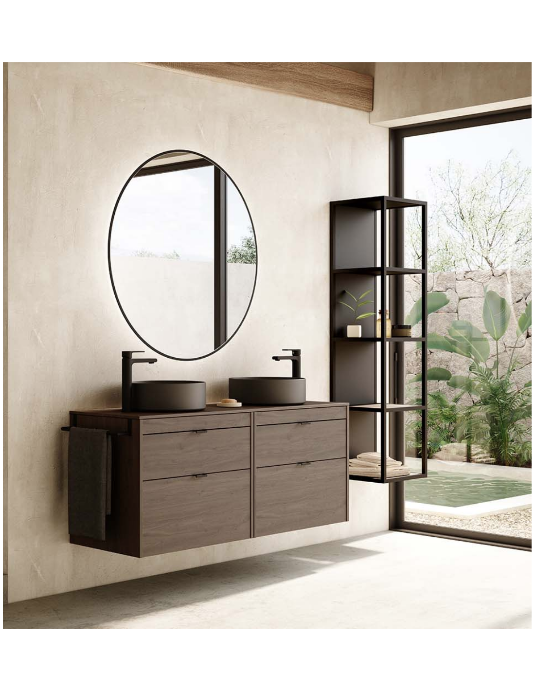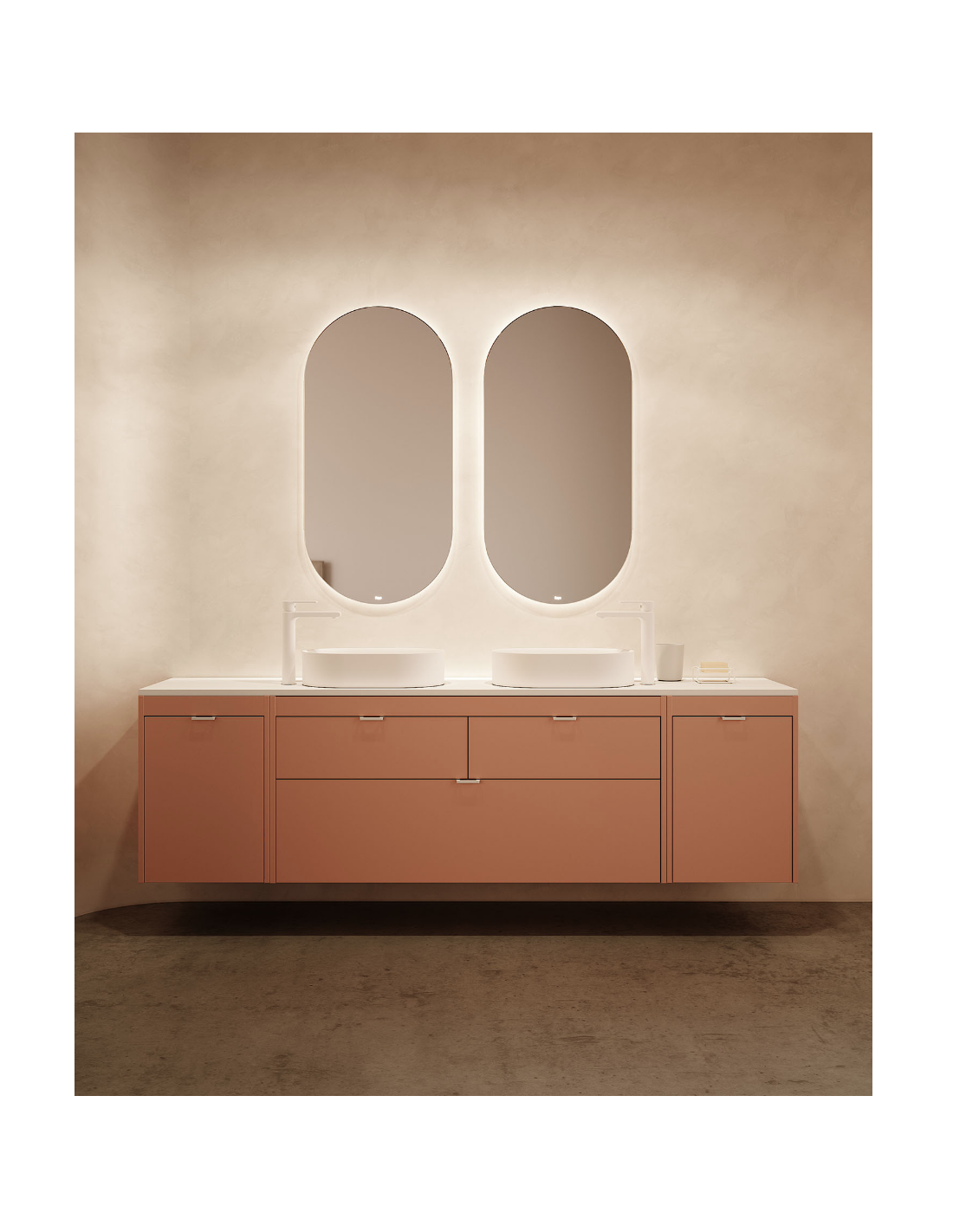 Funcionalidad con un diseño de líneas rectas, un discreto tirador integrado con nuestro logo en el cajón superior, y un frente bajo del lavabo para generar simetría.