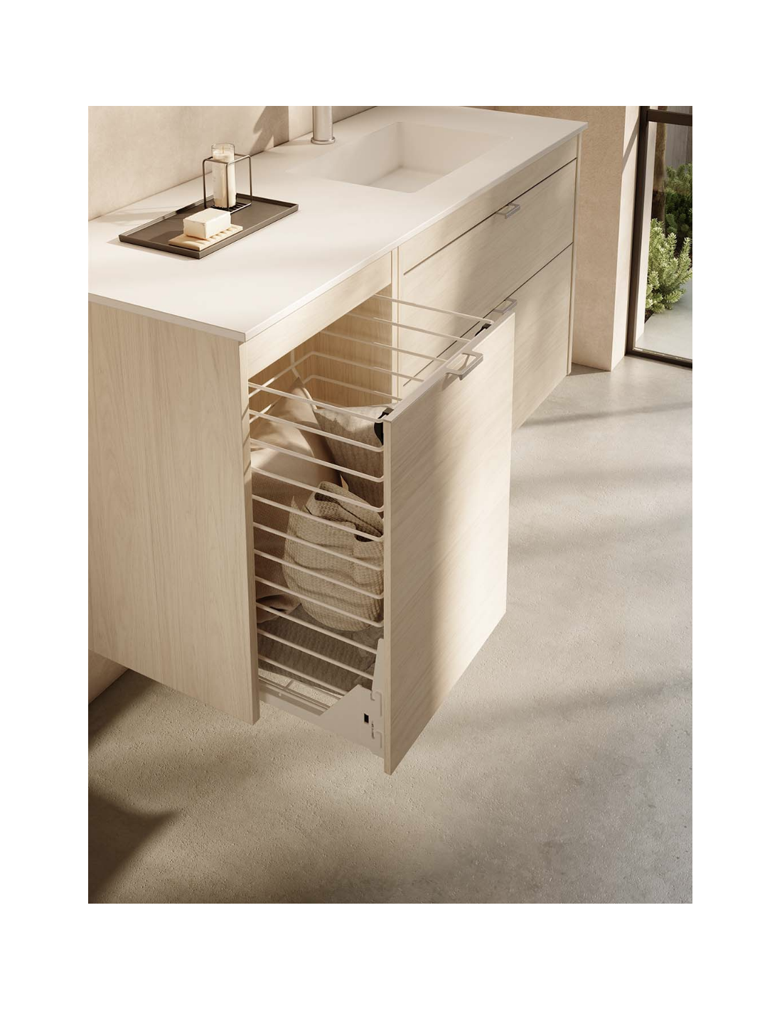 Nuevo módulo ropero, de un cajón, cuenta con una cesta metálica de acero pintado de 46 litros de capacidad, y unas guías Hettich de extracción total.