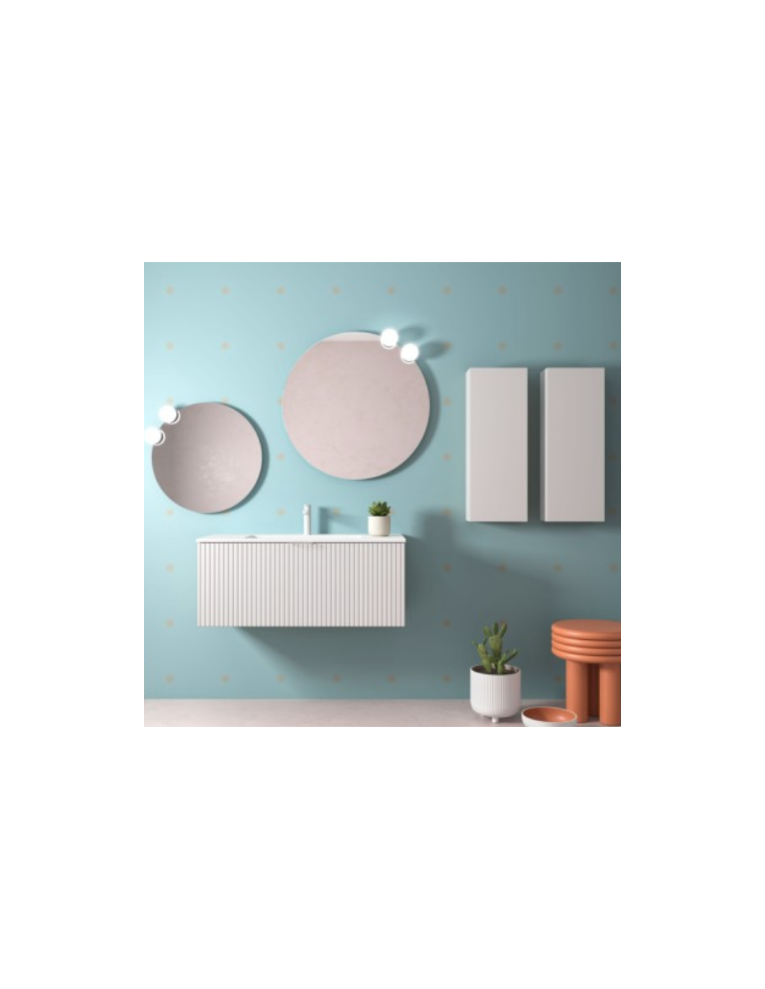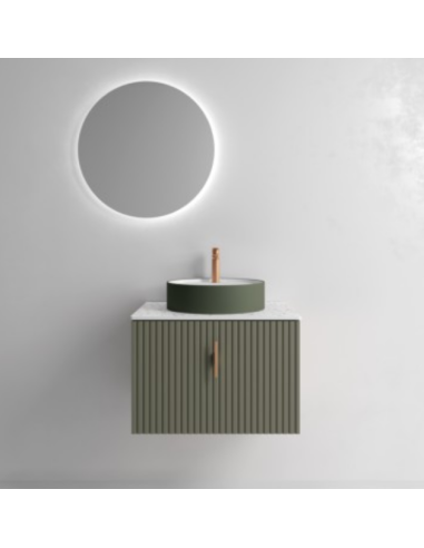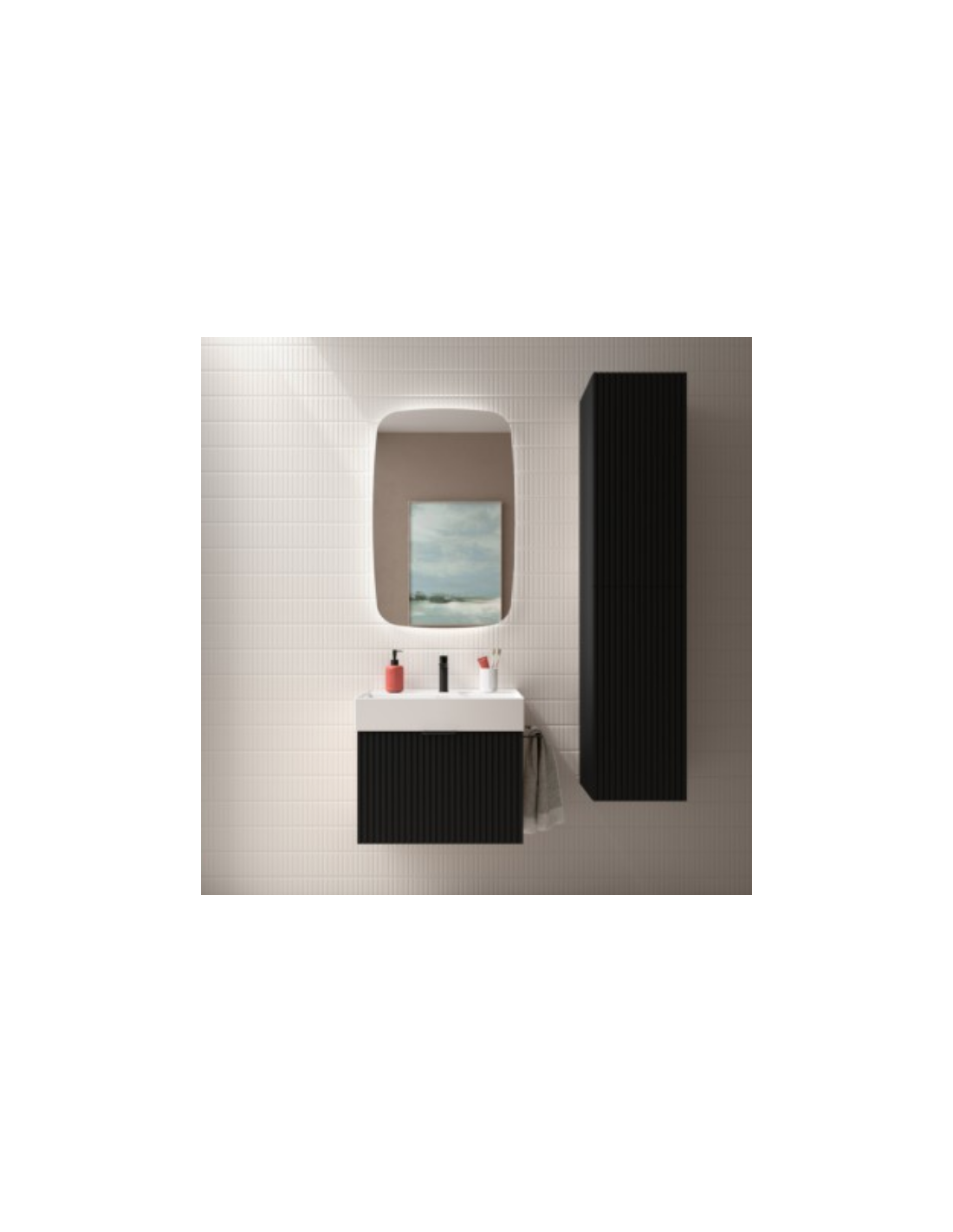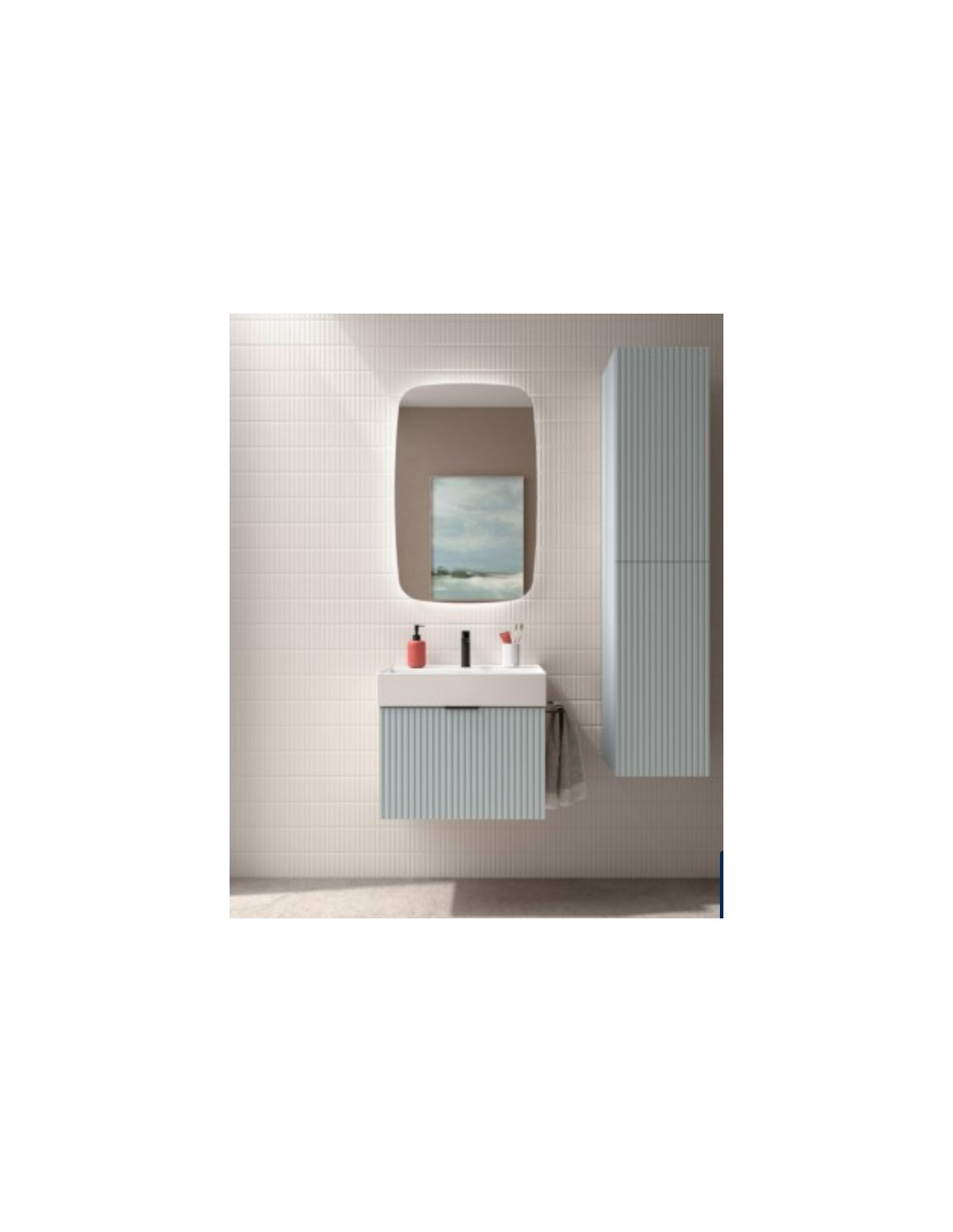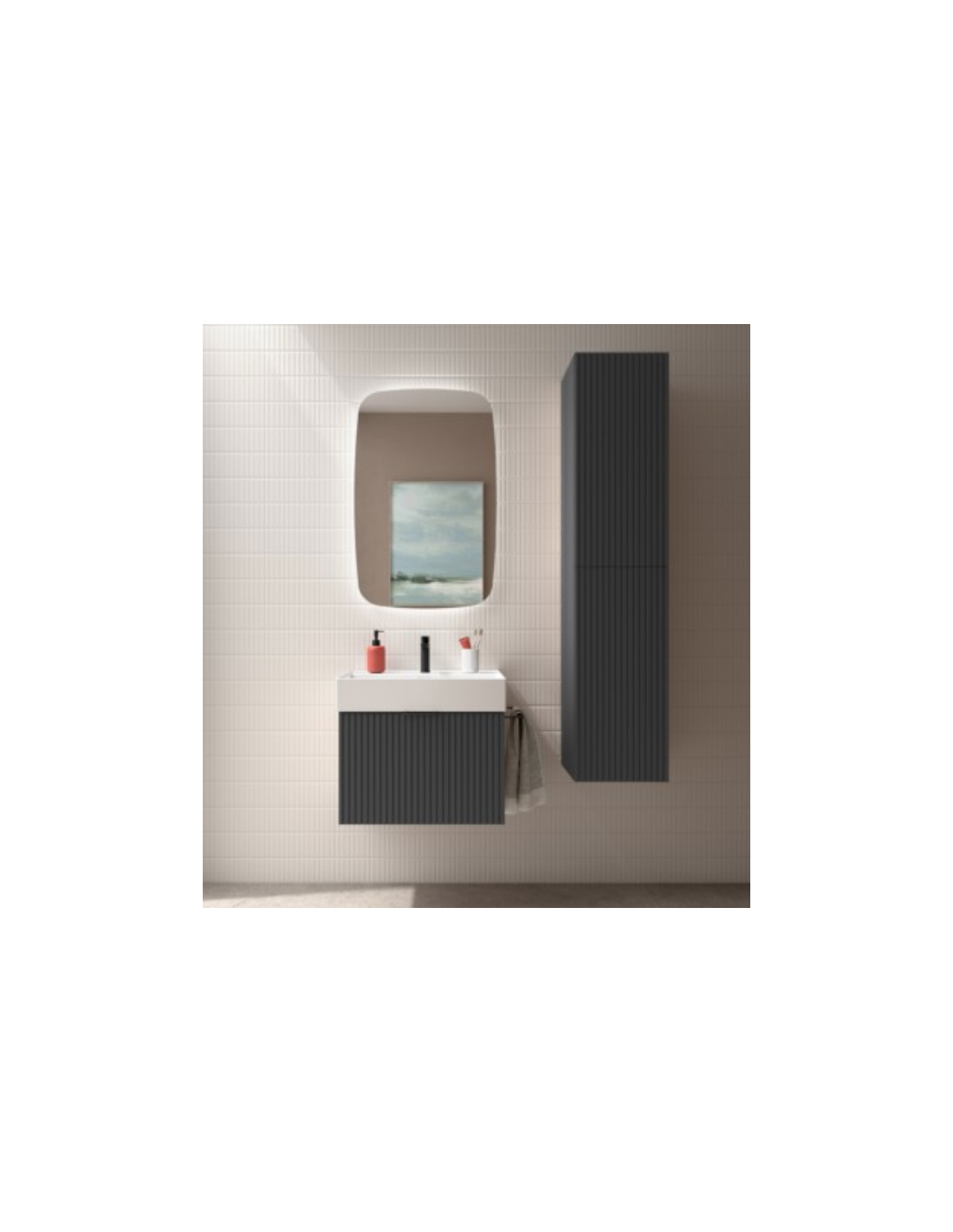 Esta colección de muebles de baño experimenta con nuevas texturas. Sus frentes mecanizados con ranuras verticales crean un patrón rítmico dándole sensación de movimiento.
