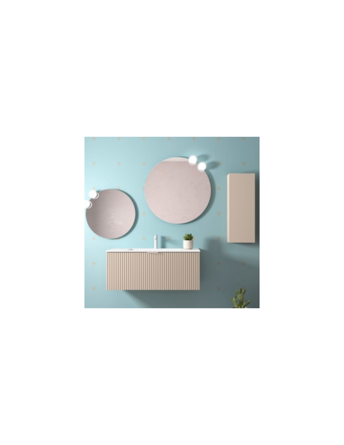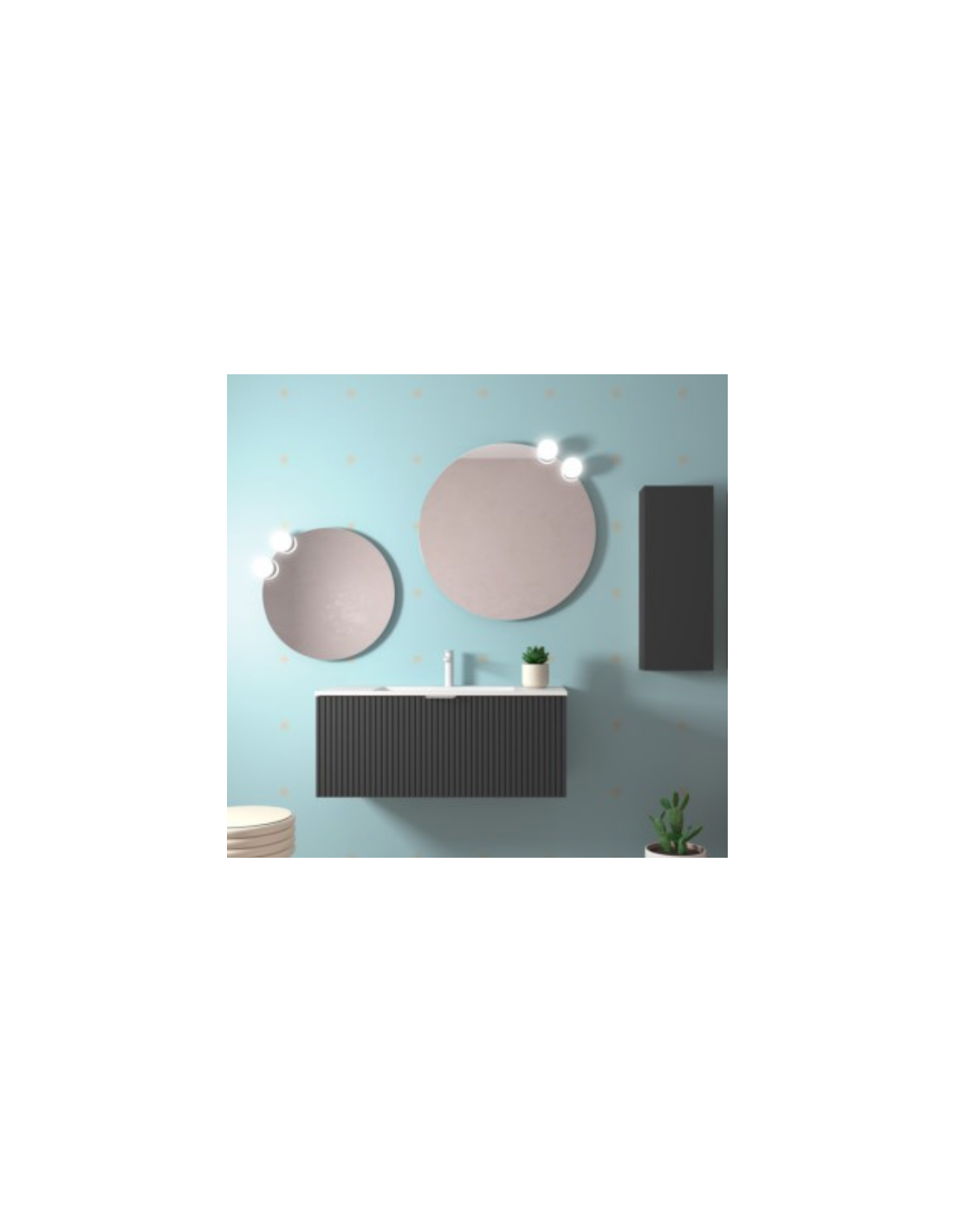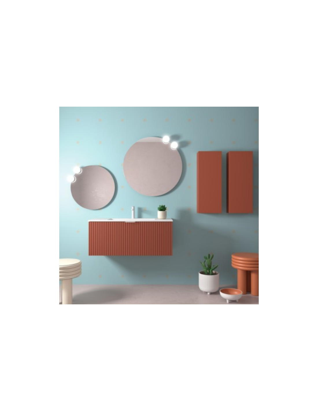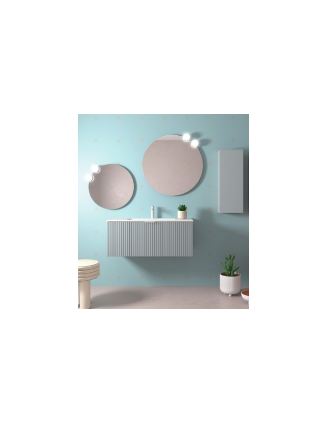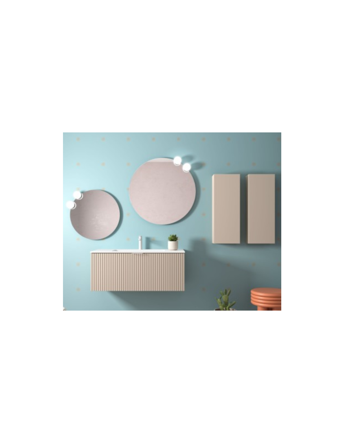 Esta colección de muebles de baño experimenta con nuevas texturas. Sus frentes mecanizados con ranuras verticales crean un patrón rítmico dándole sensación de movimiento.