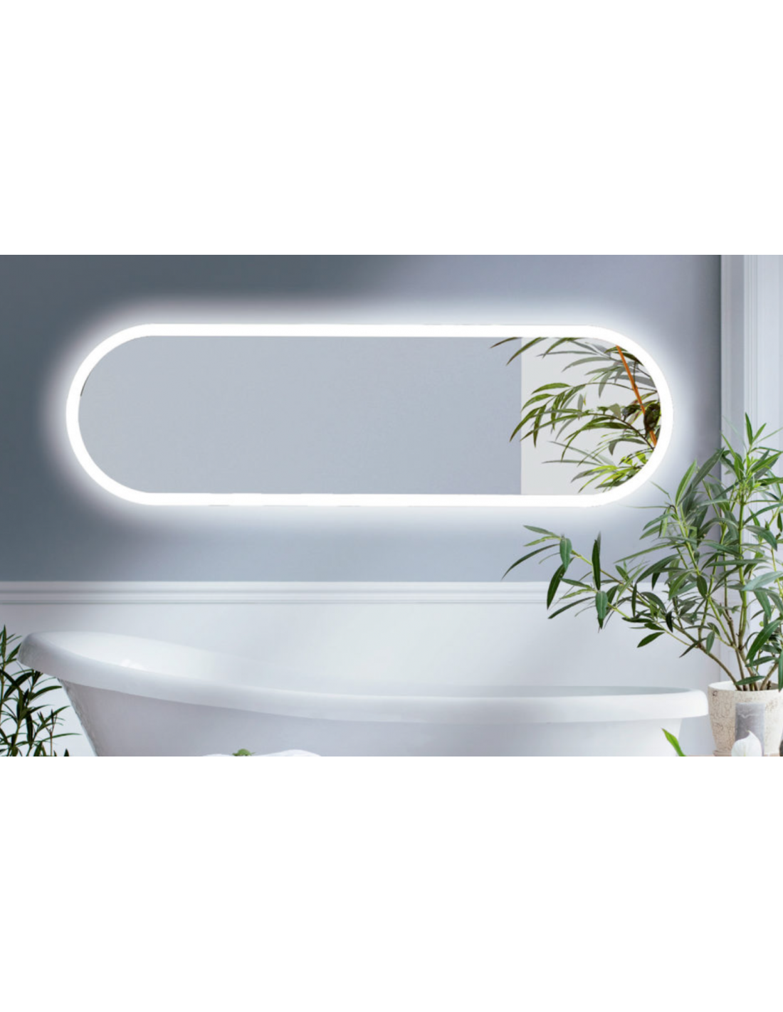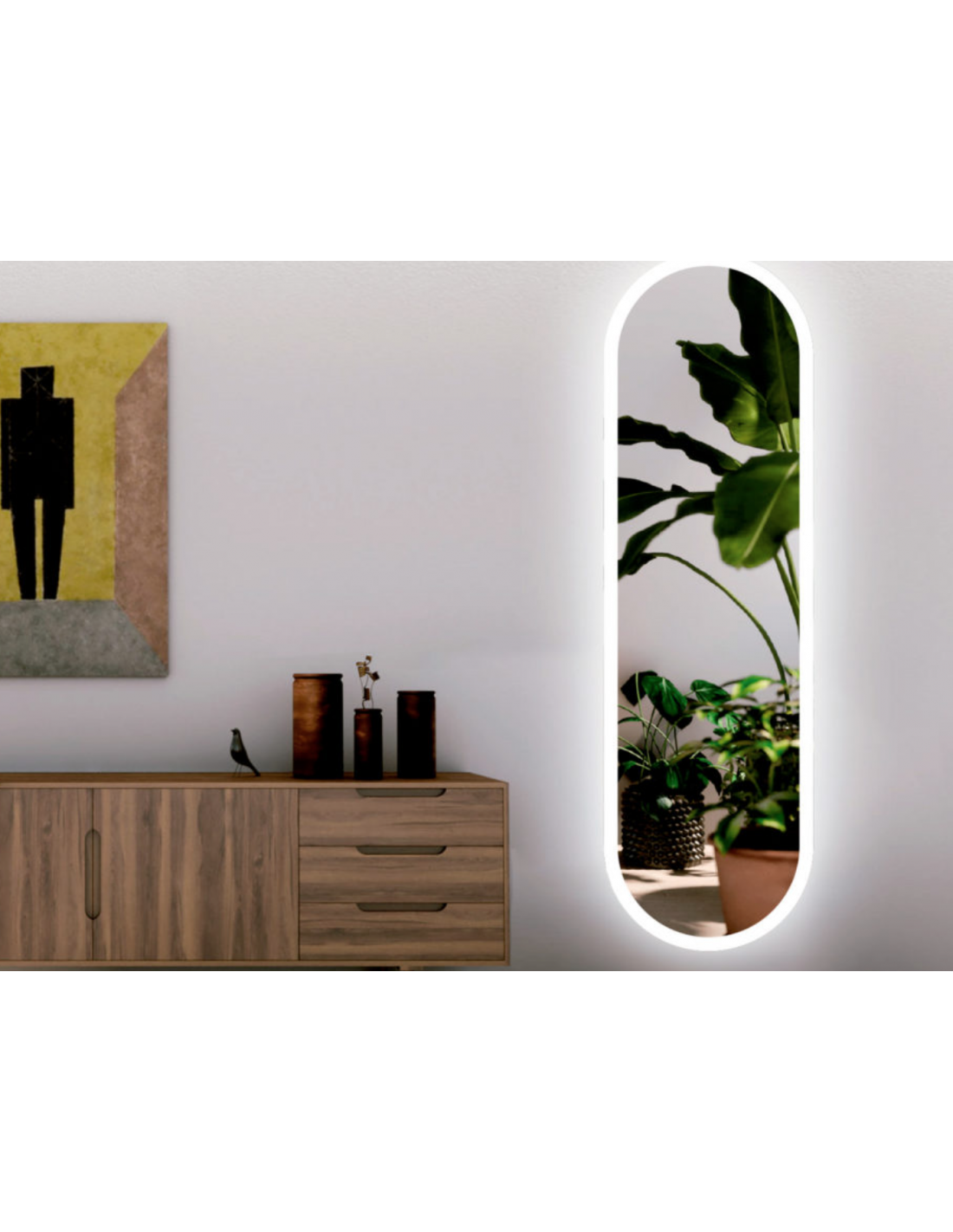 El espejo Calas es de una belleza excepcional. Esta retroiluminado por lo que parece levitar mágicamente sobre el espacio. Este modelo está pensado para colocarlo tanto en el baño como fuera de el como un espejo para el vestidor o para embellecer un salón o un recibidor.