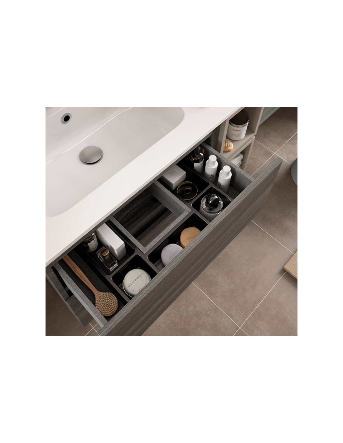 En el cajón superior se encuentra el salvasifón que te permitirá la colocación de ese lavabo que tanto te gusta. Además, incluye un exclusivo organizador de cajón superior que te ayudará con el almacenamiento de todos tus productos. El segundo cajón cuenta con un gran espacio para que puedas almacenar el resto de tus artículos de baño e higiene personal.