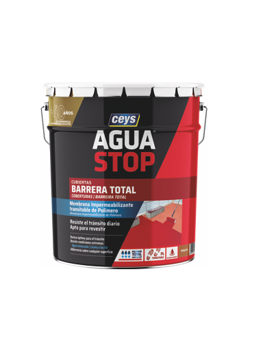 AGUASTOP BARRERA TOTAL es una membrana impermeabilizante transitable para trabajos de impermeabilización de todo tipo de superficies. La tecnología TOTAL WATERPROOF le confiere una resistencia extrema a la radiación UV, a las inclemencias meteorológicas y al tránsito peatonal diario. Pudiéndose, gracias a esta extrema resistencia, alicatar.