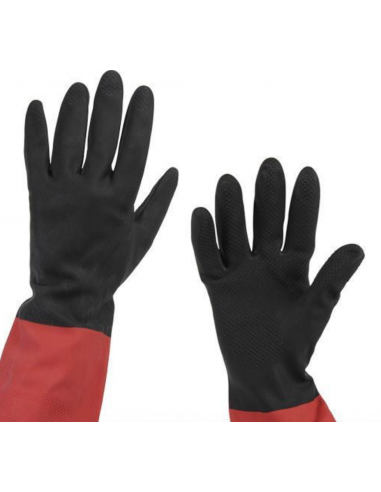 Guantes de 100% látex reforzado y flocado, fabricado en dos colores. Ideal para contacto con solventes, detergentes y productos químicos de baja peligrosidad. Construcción, limpieza, mecánica y mantenimiento.